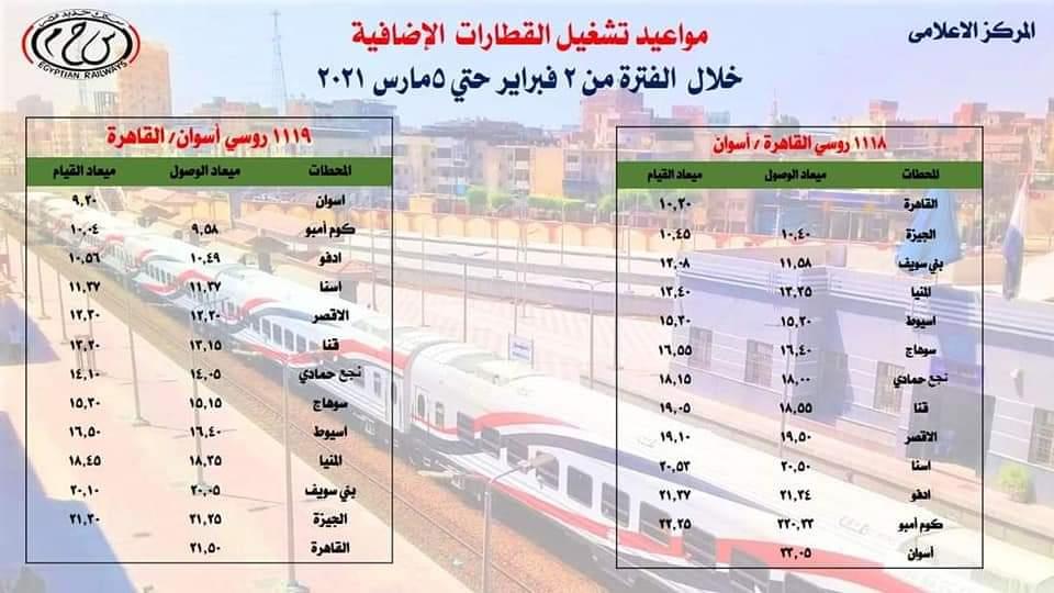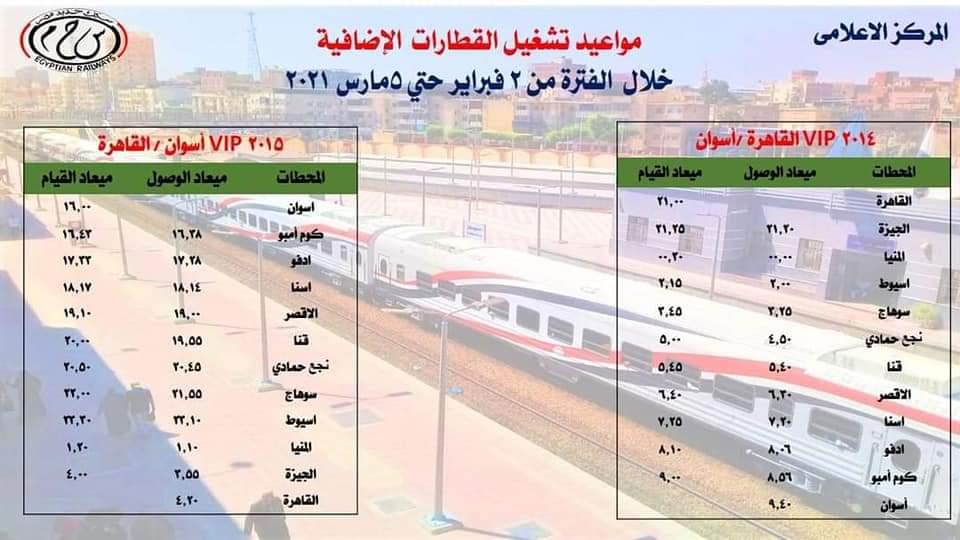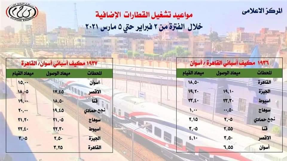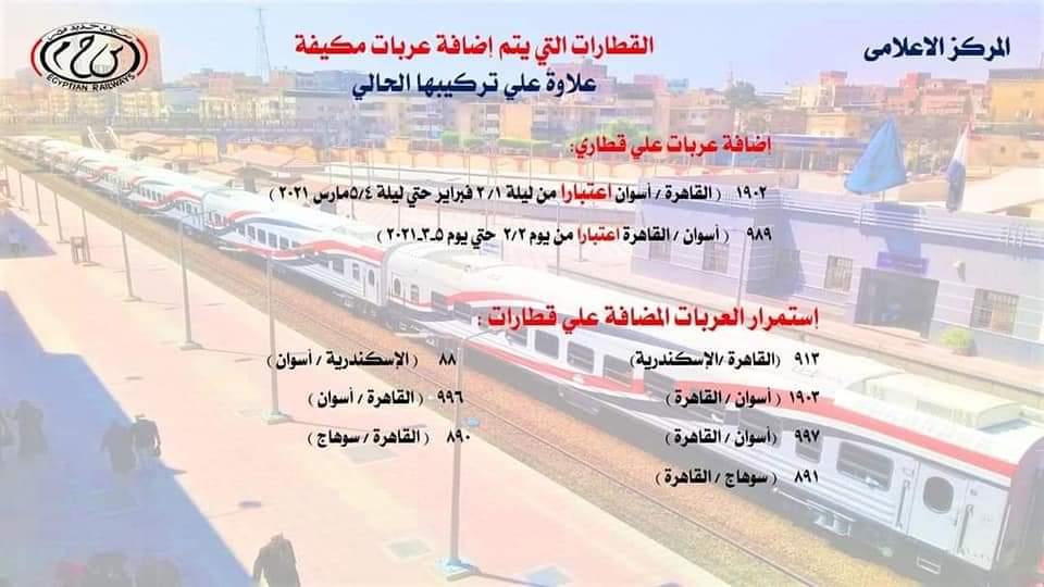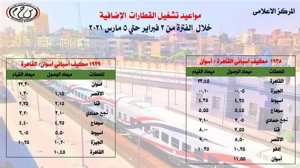 أعلنت الهيئة القومية لسكك حديد مصر، منذ قليل, عن تشغيل عدد من القطارات الإضافية والعربات على بعض القطارات الحالية خلال الفترة من 2-2-2021 وحتى 5-3-2021 ما بين الإسكندرية – القاهرة – أسوان والعكس.