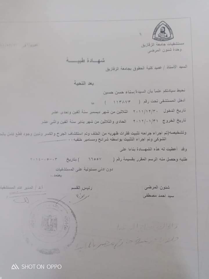 سناء حسن فتاة فى مقتبل عمرها، 28 عاماً ، من مركز ديرب نجم بمحافظة الشرقية ، تخرجت من كلية الحقوق بجامعة الزقازيق ، فى عام 2011 تعرضت سناء لحادث مرورى أثناء عودتها من الجامعة، وأسفر الحادث عن قطع فى الحبل الشوكى ، مما أدى ذلك إلى حدوث شلل نصفى وتحتاج لإجراء عملية خارج البلاد. وتروي سناء حسن لـ ” شبكة يو دبليو إن” مشوار العلاج ، وكيف تم الرد على استغاثاتها ، وما متطلباتها؟