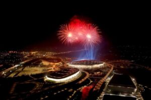 ومن أبرز تجليات هذه الرؤية “المدينة الأولمبية”، وهي مجمّع رياضي يمتد على مساحة 100 هكتار، جرى افتتاحه في أغسطس 2025. ويُعد أكبر مجمّع رياضي في آسيا الوسطى، ويضم خمسة مرافق رئيسية، من بينها استاد يتسع لـ12 ألف متفرج، ومضمار للدراجات، ومرافق للرياضات الجماعية والفنون القتالية، إضافة إلى مركز متكامل للألعاب المائية. كما شكّل قلب انطلاق “الأولمبياد الرئاسي 2025″، واعتمده المجلس الأولمبي الآسيوي رسميًا مركزاً رئيسياً لدورة الألعاب الآسيوية للشباب الرابعة عام 2029.
