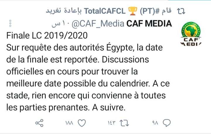 وأضاف: “بناء على طلب السلطات المصرية، تم تأجيل موعد المباراة النهائية، المناقشات الرسمية جارية للوصول إلى أفضل موعد ممكن”.