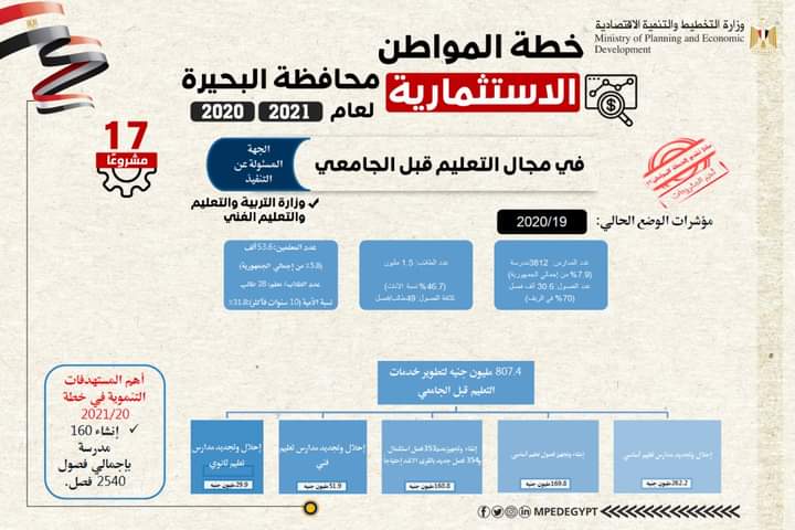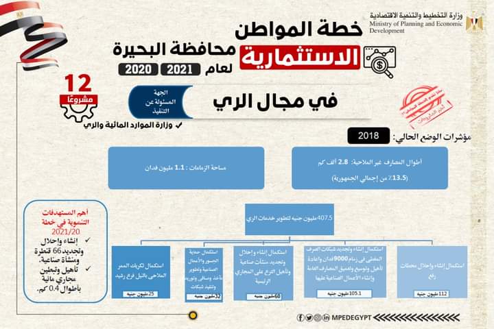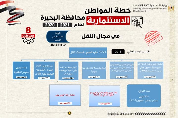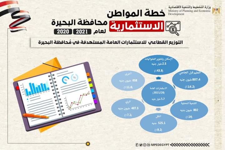 أعلنت وزارة التخطيط والتنمية الاقتصادية ملامح “خطة المواطن الاستثمارية” في محافظة البحيرة للعام المالي 20/2021، وذلك في إطار مواصلة الإعلان عن خطة المواطن في كافة محافظات الجمهورية للعام الثاني على التوالي، بهدف تفعيل المشاركة المجتمعية، وإشراك المواطنين في التخطيط والمتابعة.