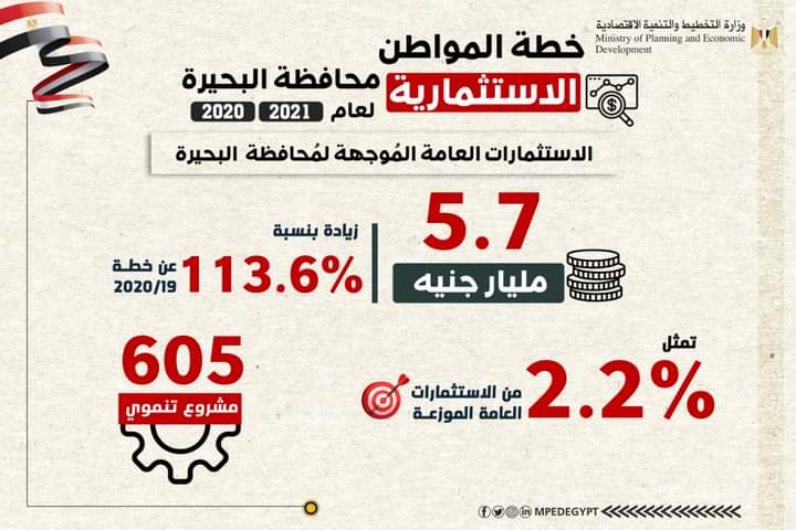 وحول خطة المواطن الاستثمارية بمحافظة البحيرة أوضحت السعيد أن عدد المشروعات التنموية بالمحافظة يصل إلى 605 مشروعًا، وأن قيمة الاستثمارات العامة الموجهة لمحافظة البحيرة بخطة عام 2020\2021 تبلغ 5,7 مليار جنيه بنسبة زيادة 113,6% عن خطة عام 2019/2020 تمثل 2,2% من الاستثمارات العامة الموزعة، لافتة إلى تحقيق نسبة نمو قدرها 25,7% في الاستثمارات الممولة من الخزانة العامة والموجهة للمحافظة.
