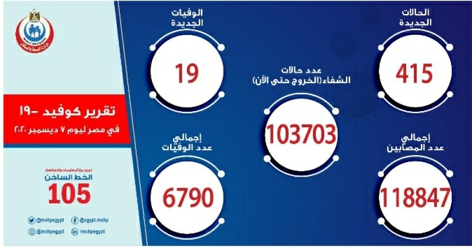 وأوضح الدكتور خالد مجاهد مستشار وزيرة الصحة والسكان لشئون الإعلام والمتحدث الرسمي للوزارة، أنه تم تسجيل 415 حالة جديدة ثبتت إيجابية تحاليلها معمليًا للفيروس، وذلك ضمن إجراءات الترصد والتقصي والفحوصات اللازمة التي تُجريها الوزارة وفقًا لإرشادات منظمة الصحة العالمية، لافتًا إلى 19 حالة جديدة.
