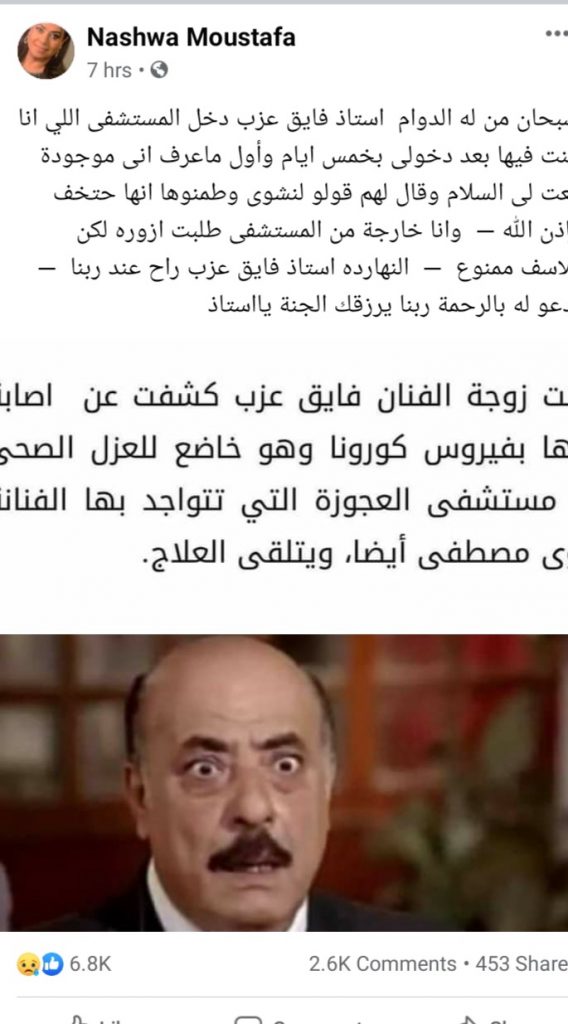 وكشفت الفنانة «نشوى مصطفى»، كواليس تواجدها مع «فايق عزب»، في المستشفى، عبر حسابها على موقع التواصل الاجتماعي «فيسبوك»، وكتبت: “سبحان من له الدوام.. أستاذ فايق عزب دخل المستشفى اللي أنا كنت فيها، بعد دخولي بخمس أيام، وأول ما عرف أني موجودة، بعت لي السلام.. وقال لهم قولو لنشوى وطمنوها أنها حتخف بإذن الله.. وأنا خارجة من المستشفى طلبت أزوره لكن للأسف ممنوع.. النهاردة أستاذ فايق عزب راح عند ربنا”، وطالبت جمهورها بالدعاء للفنان الراحل بالرحمة والمغفرة.