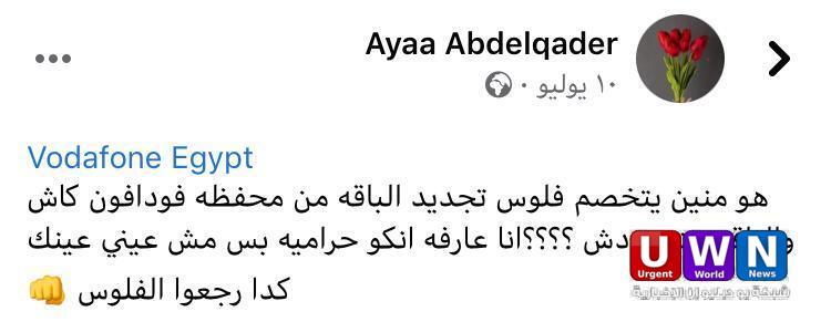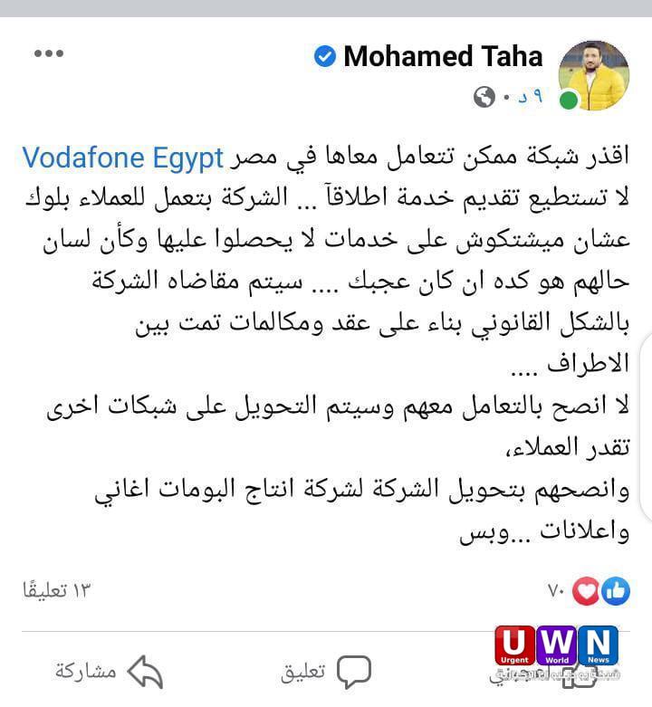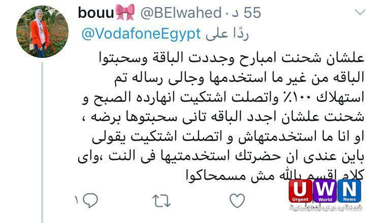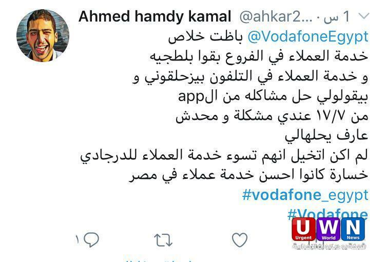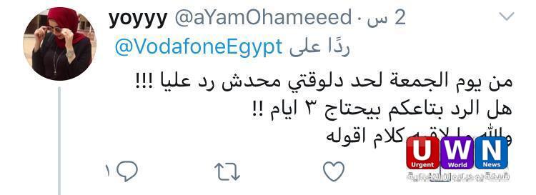 وجاءت بعض الشكاوي على موقع التدوينات القصيرة “تويتر” و موقع التواصل الاجتماعي “فيس بوك” ، التي يوضح فيها بعض العملاء معاناتهم مع شركة “فودافون” ومن ضمن هذه التغريدات :”من يوم الجمعة لحد دلوقتي محدش رد عليا …هل الرد بتاعكم بيحتاج ٣ ايام”