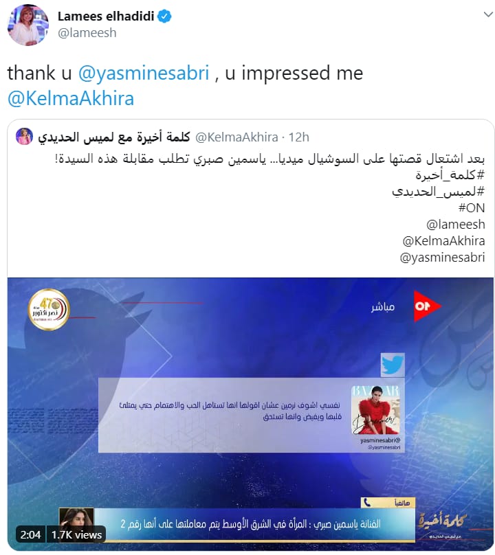 كما قامت لميس الحديدى بالتغريد عبر حسابها بموقع التواصل الاجتماعى تويتر قائله :”شكرا ياسمين صبرى، لقد أبهرتينى”