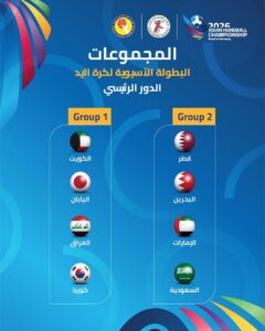 وطبقا لنظام البطولة تأهل أول وثاني كل مجموعة من الدور التمهيدي إلى الدور الرئيسي ، بحيث ضمن المجموعة الأولى منتخبات كوريا والكويت والعراق واليابان ، بينما جاء في المجموعة الثانية قطر والبحرين والإمارات والسعودية ، ويتأهل اول وثاني من المجموعتين إلى نصف نهائي البطولة ” وتحجز بطاقة التأهل الأربعة إلى بطولة العالم 2027”.